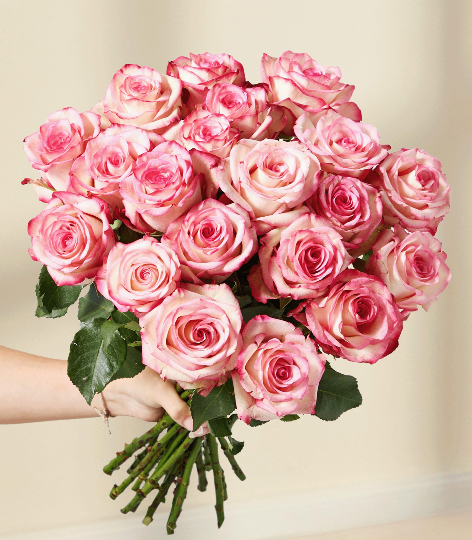 Ein Strauß leuchtend rosa Rosen, den eine Person vor einem schlichten weißen Hintergrund in den Händen hält.