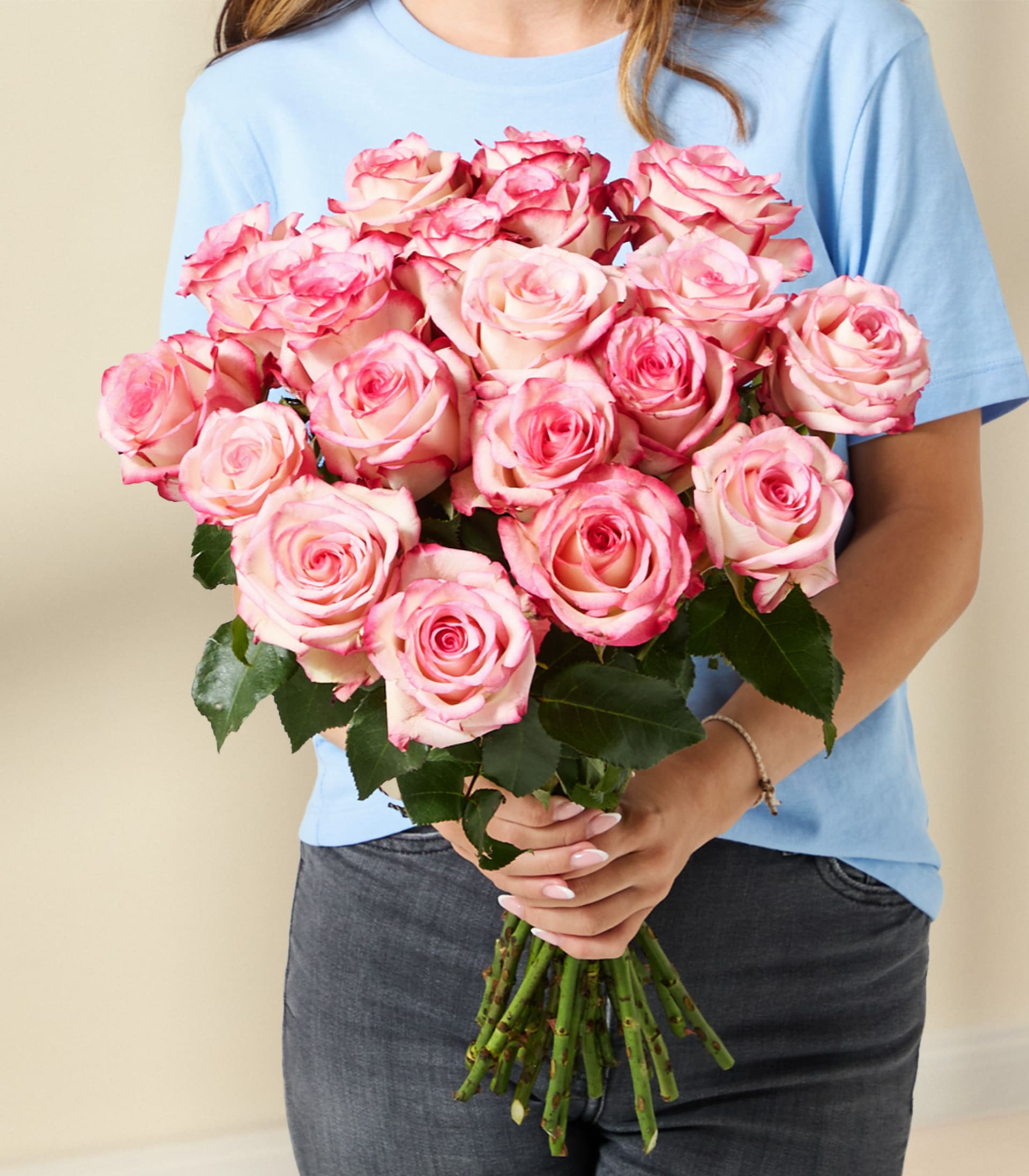 Eine junge Frau in einer Jeansjacke hält einen großen Strauß leuchtend rosa Rosen vor einem schlichten weißen Hintergrund.