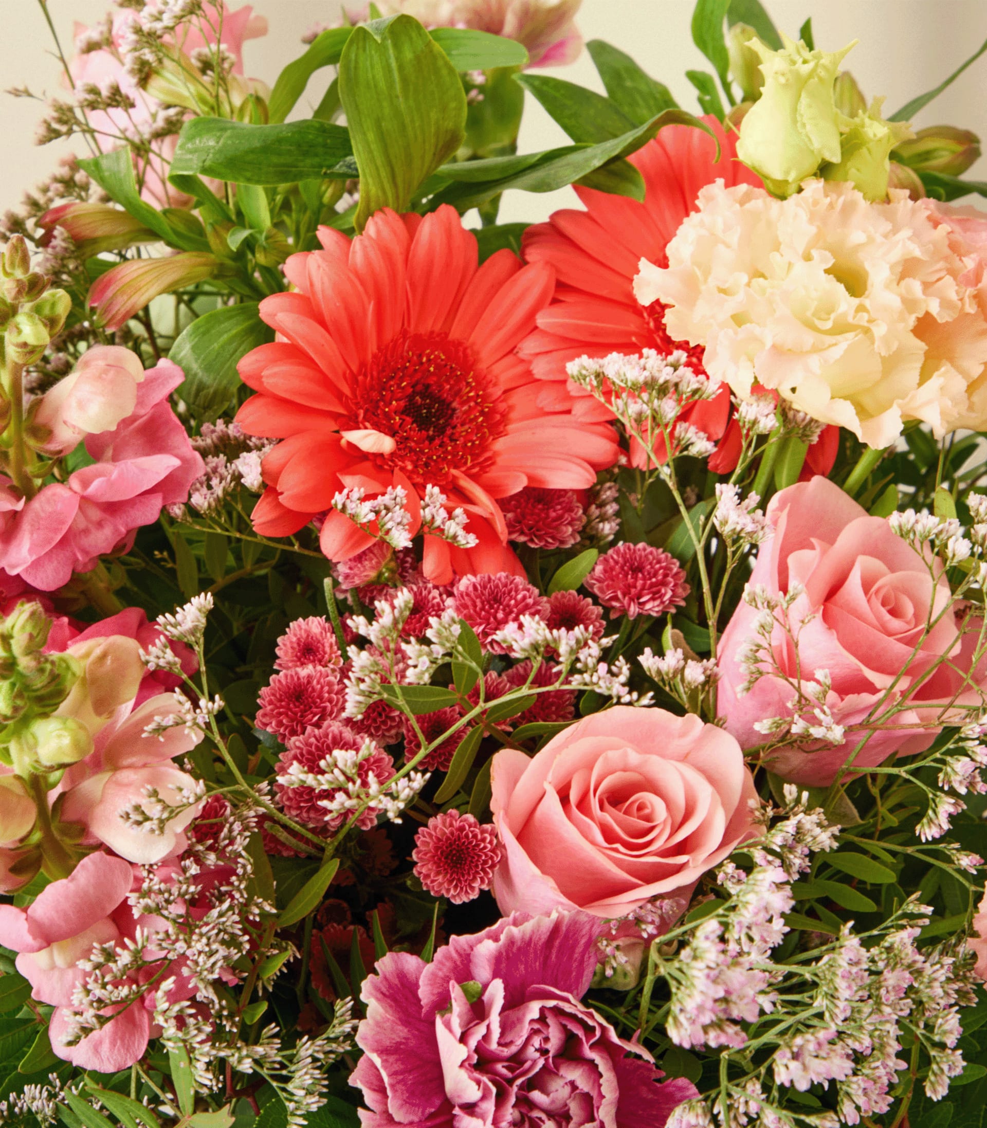 Dieser Strauß wirkt wie ein sanftes Erwachen nach langer Winterruhe. Die warmen Farben von Gerbera, Rosen und Alstromerien verbinden sich mit dem zarten Spiel von Eustoma und Limonium zu einer harmonischen Frühlingskomposition. Das Löwenmaul setzt aufrechte Akzente, während Johanniskraut und Pistazie dem Arrangement eine natürliche Fülle geben. Mit seiner Stiellänge von 30 cm ist dieser handgebundene Strauß ideal, um deinen Lieblingsmenschen zu überraschen und ein Gefühl von Leichtigkeit zu verschenken. Jede Blüte erzählt von neuem Aufbruch – ein liebevoller Gruß, der den Alltag aufhellt und ein kleines Stück Farbe ins Zuhause bringt!