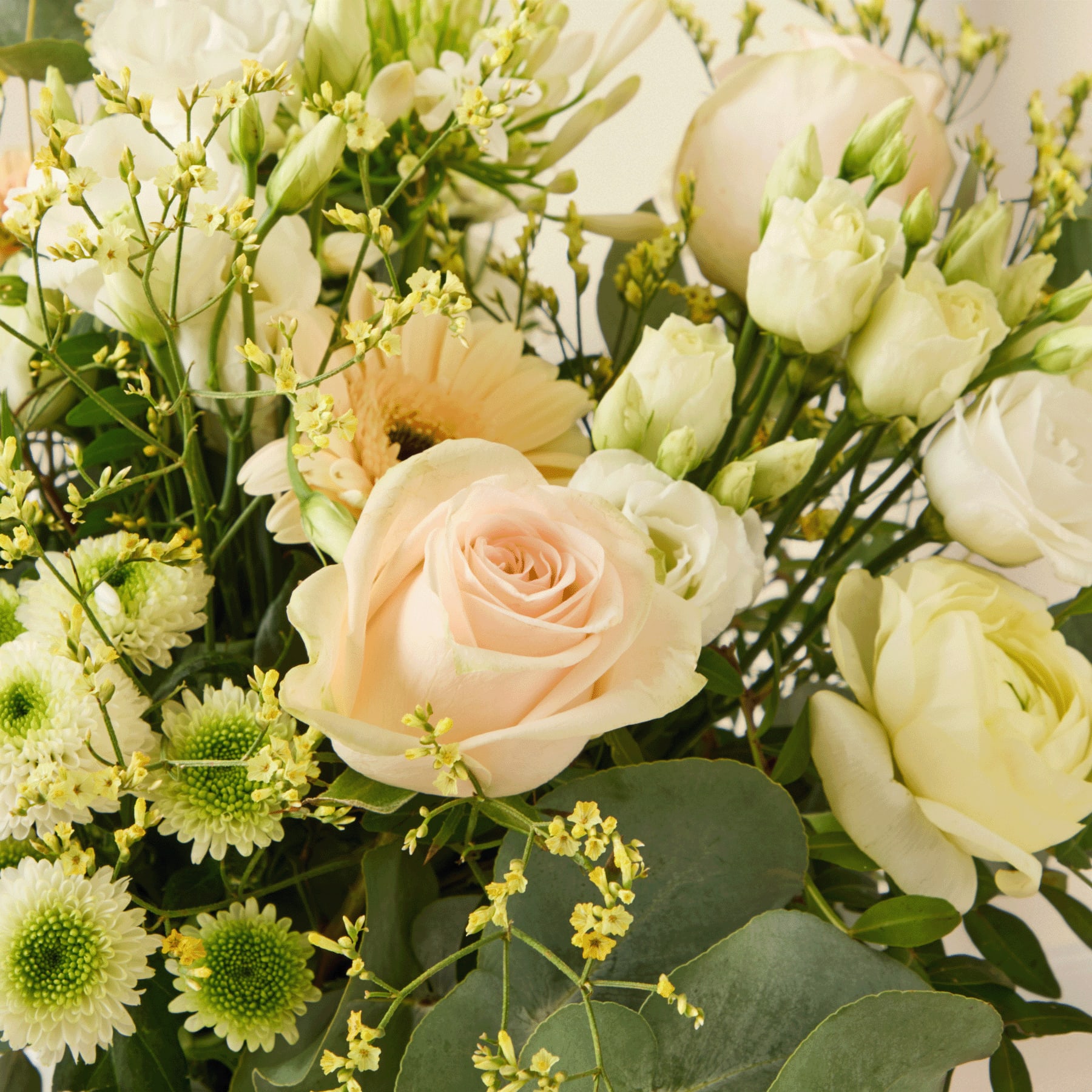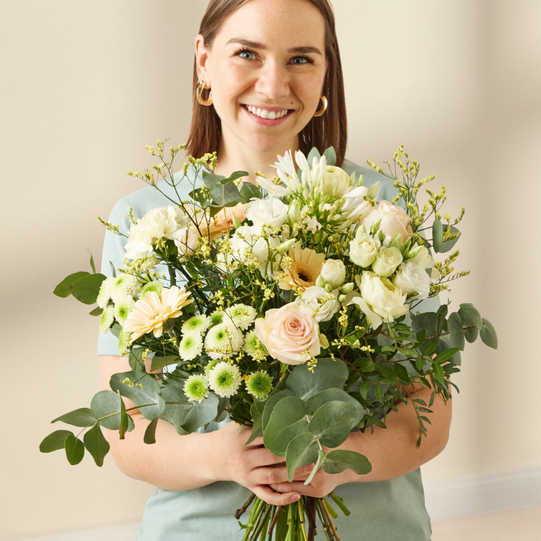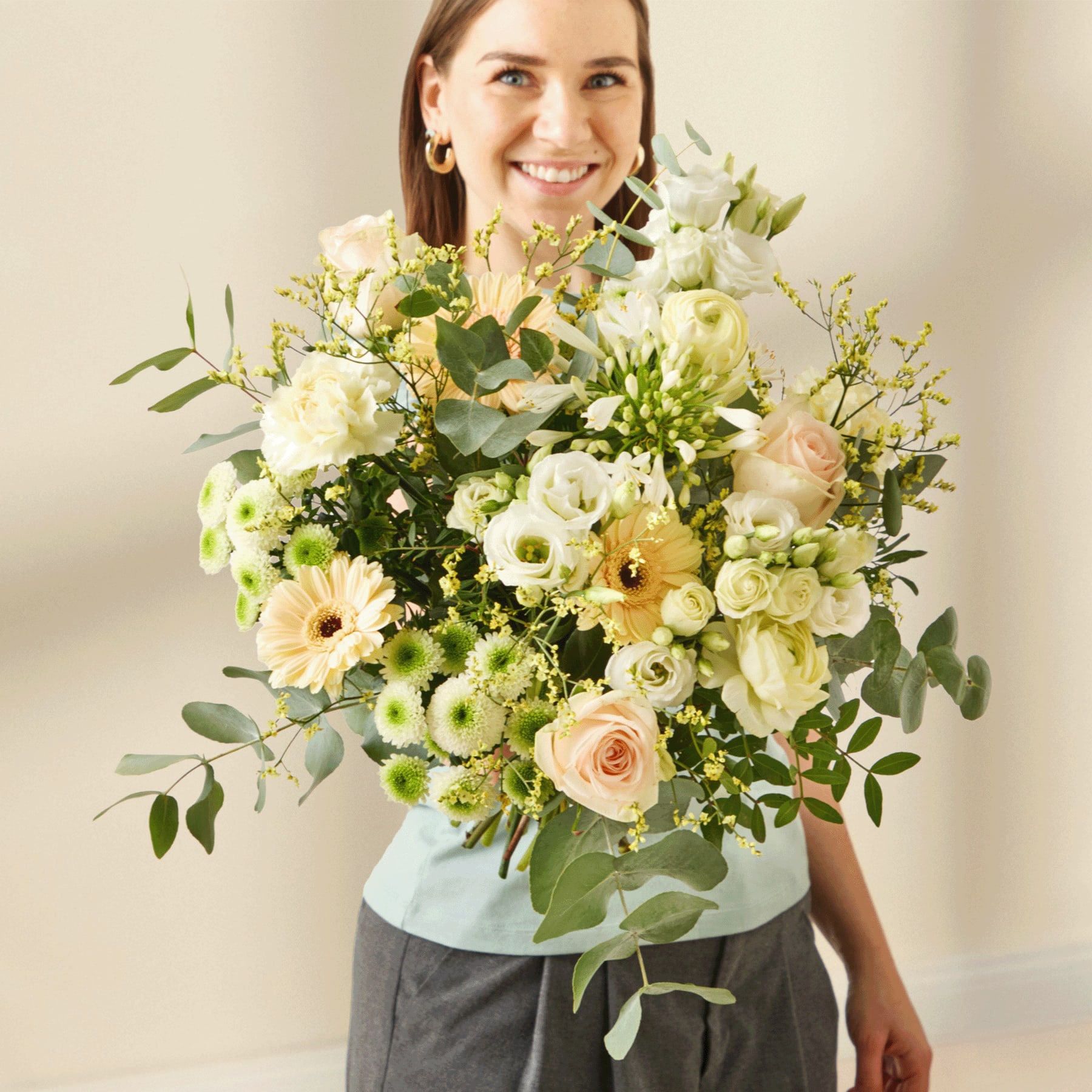 White Dream ist ein Strauß für alle, die die reine, klare Schönheit der Natur lieben. Zarte Ranunkeln, elegante Rosen und verspielte Nelken bilden das weiche Herz des Arrangements. Eukalyptus bringt moderne Frische, während Eustoma und Chrysanthemen feine Strukturen ergänzen. Die helle Farbpalette wirkt wie ein Wintermorgen voller Licht und Stille. Limonium und Pistazie runden das Bild mit natürlicher Textur ab. Mit 50 cm Stiellänge erinnert dieser Wiesenblumenstrauß an frostige Eleganz und sanfte Harmonie. Ein liebevoller Gruß, der Ruhe schenkt und gleichzeitig Geborgenheit vermittelt – ideal für besondere Menschen, denen du etwas Reines und Zeitloses schenken möchtest!