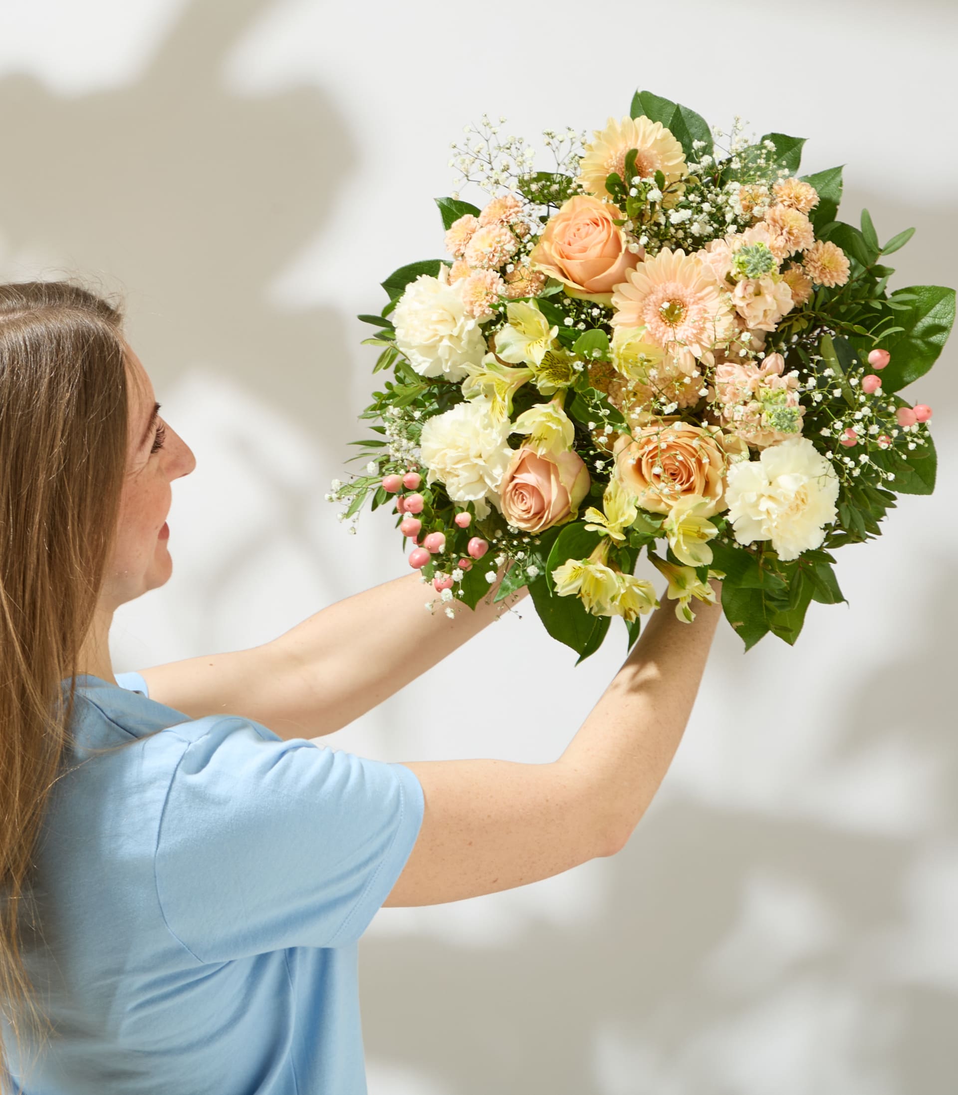 Warme Orangetöne treffen auf frisches Weiß – ein Zusammenspiel, das sofort gute Laune macht. Im Mittelpunkt stehen Levkojen, die nicht nur durch ihre strukturierte Blüte, sondern auch durch ihren zarten Duft begeistern. Umrahmt von Rosen, Gerbera und Alstromerien entsteht ein ausdrucksstarker Strauß mit ca. 32 cm Durchmesser. Schleierkraut und Johanniskraut lockern das Arrangement auf, während Salal und Pistazie für grüne Frische sorgen. Sweet Spring bringt sonnige Energie in jeden Raum und erinnert daran, wie schön der Frühling duften kann.