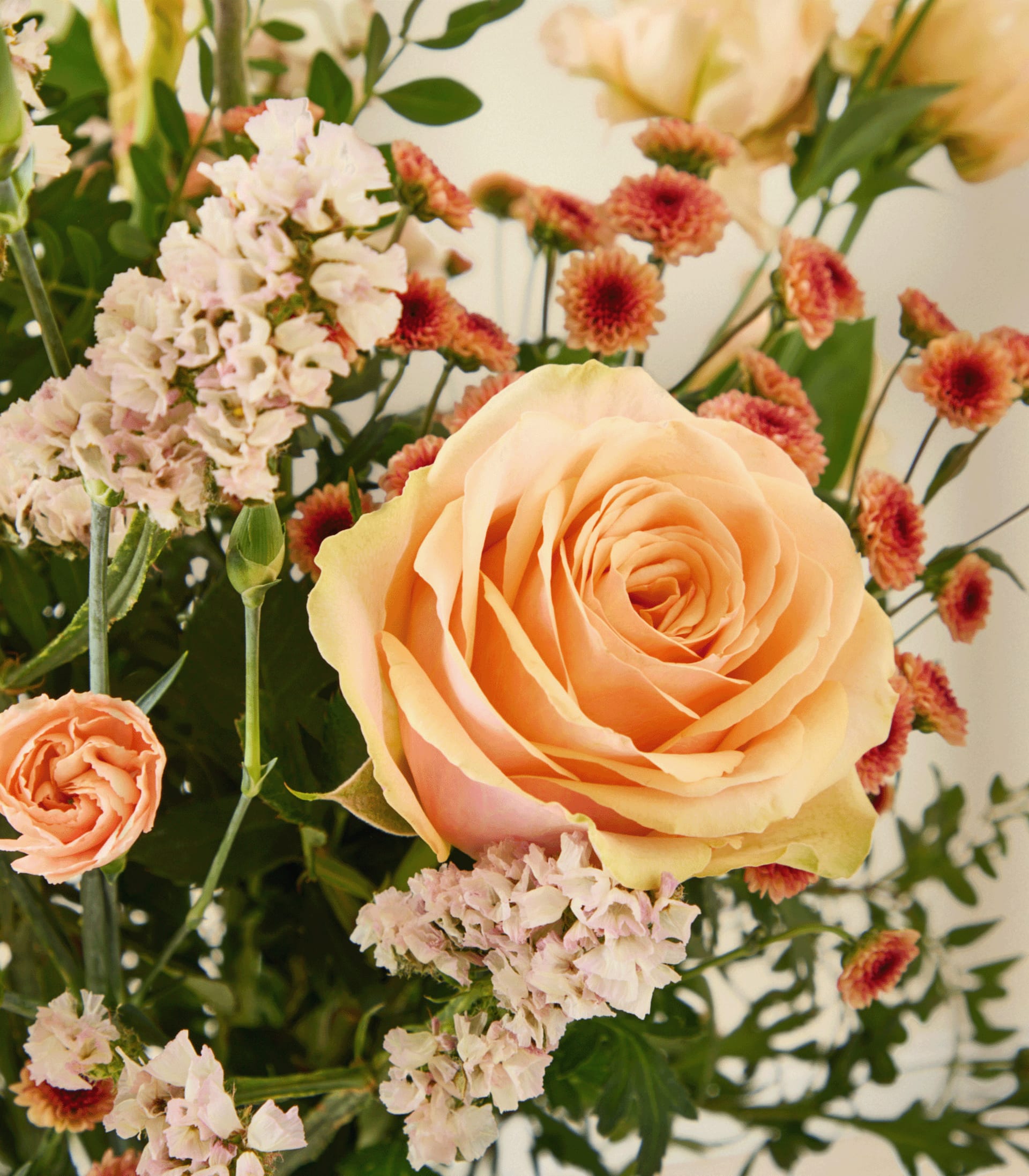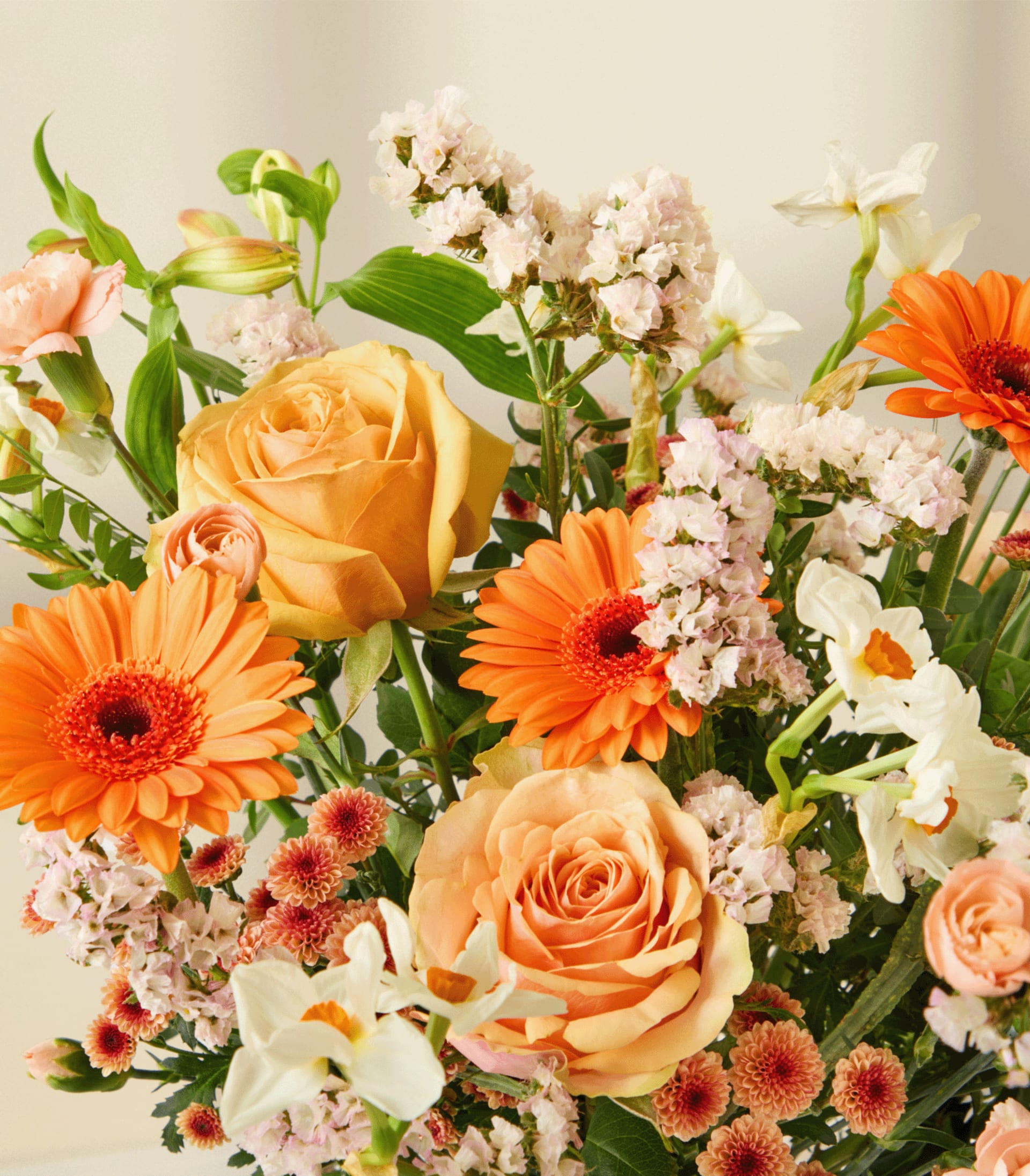 Dieser Wiesenblumenstrauß vereint die Energie des Frühlings mit warmen, freundlichen Orangetönen. Narzissen bringen strahlende Akzente ein und symbolisieren Neubeginn, während Alstromerien und Rosen eine weiche Emotionalität erzeugen. Nelken und Chrysanthemen geben dem Strauß Volumen, Eustoma sorgt für elegante Leichtigkeit. Limonium und Pistazie runden das Gesamtbild mit natürlicher Textur ab. Mit 50 cm Stiellänge wirkt unser Strauß Frühlingsgeflüster groß und frei, fast wie ein Arm voller Sonnenstrahlen. Ein wunderbares Geschenk für Menschen, die du aufmuntern, überraschen oder einfach herzlich umarmen möchtest – ohne Worte, dafür mit floraler Wärme!