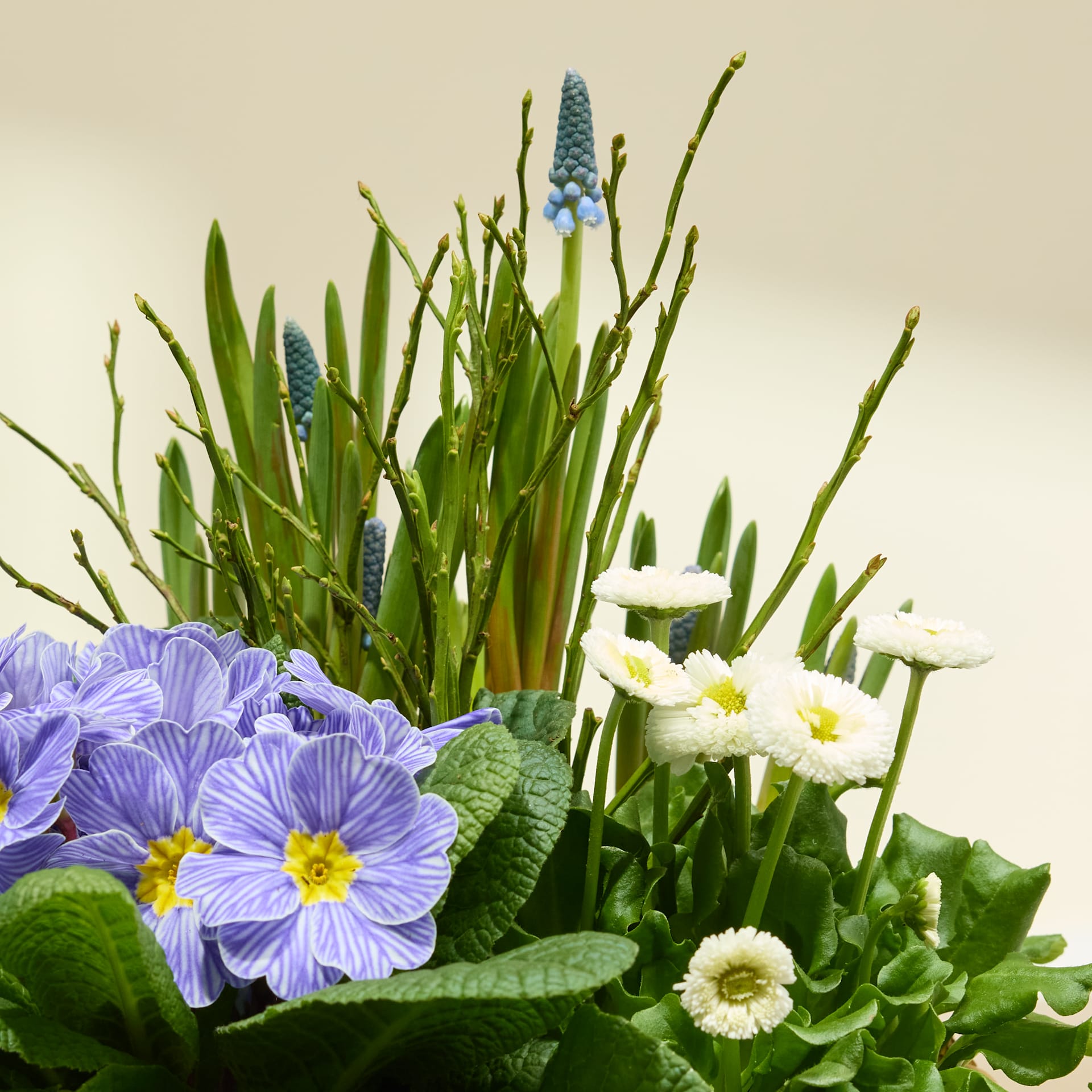 Mit Blaupause verschenkst du ein kleines Frühlingsgefühl, das jeden Tag aufs Neue Freude schenkt. Bellis, Primeln und Muscari verbinden sich zu einem lebendigen Arrangement voller Farben, Leichtigkeit und natürlicher Harmonie. Liebevoll im Korb arrangiert, wirkt dieses Pflanzengeschenk wie ein gemalter Frühlingsmoment – frisch, freundlich und herzlich. Ob auf dem Balkon, der Terrasse oder vor der Haustür: Dank ihrer Outdoor-Eignung fühlen sich die Pflanzen draußen besonders wohl und zeigen dort ihre ganze Blütenpracht. Blaupause ist das ideale Geschenk, um deinen Lieblingsmenschen eine Auszeit vom Alltag zu schenken und zu zeigen, wie sehr du an sie denkst. Ein natürlicher Gruß, der bleibt, wächst und jeden Tag ein Lächeln zaubert.