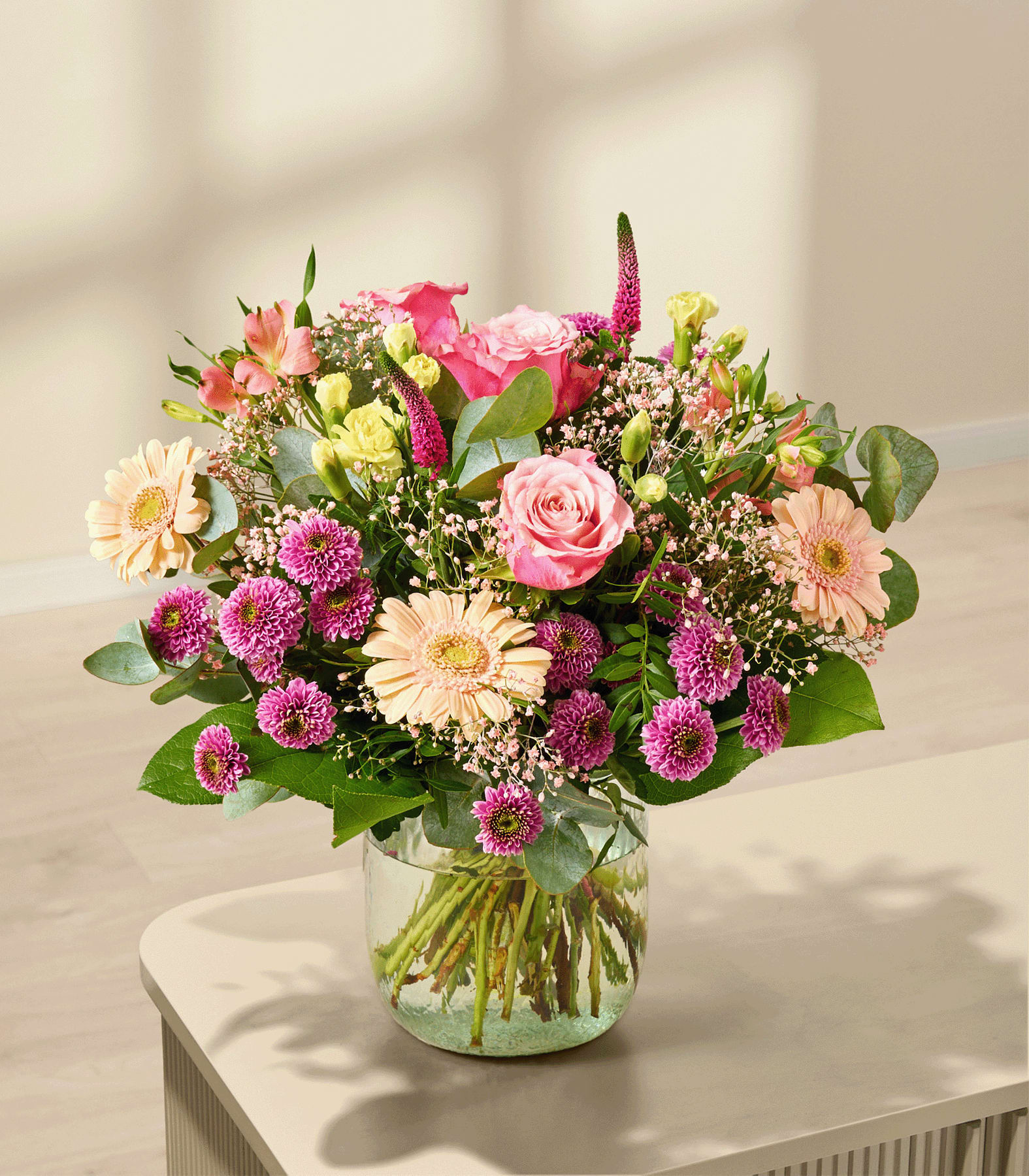 Jede gute Freundschaft will gepflegt werden. Teile deinen Mitmenschen daher mit, wie viel sie dir bedeuten. Mit unserem opulenten Blumenstrauß namens Schön, dass es dich gibt ist das ohne viele Worte möglich. Das leuchtende Arrangement in Rot, kräftigem Pink und zartem Rosé erreicht den Empfänger mit einem stattlichen Durchmesser von ca. 28 cm. Zusammengesetzt ist die atemberaubende Pracht aus zauberhaften Chrysanthemen, herrlichen Gerbera, sowie verspielten Nelken, eleganten Rosen, schönen Alstromerien und niedlichen Veronika. Frisches Grün in Form von Salal, Pistazie und dekorativen Eukalyptuszweigen vervollständigt den beeindruckenden Blumenstrauß. Hier zeigt sich die Natur von ihrer schönsten Seite. Es sind genau diese Überraschungen, die das Leben schöner machen.